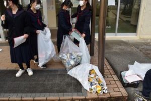 11月22日(火)今日は朝から霧でしたが、お昼に近づくにつれ、太陽の暖かい日差しが気持ちのいい1日となりました。朝7:50から8:05の間、ボランティア委員会がアルミ缶・ペットボトル回収を行いました。多くの生徒がアルミ缶やペットボトルキャップをビニール袋に入れ、登校しました。